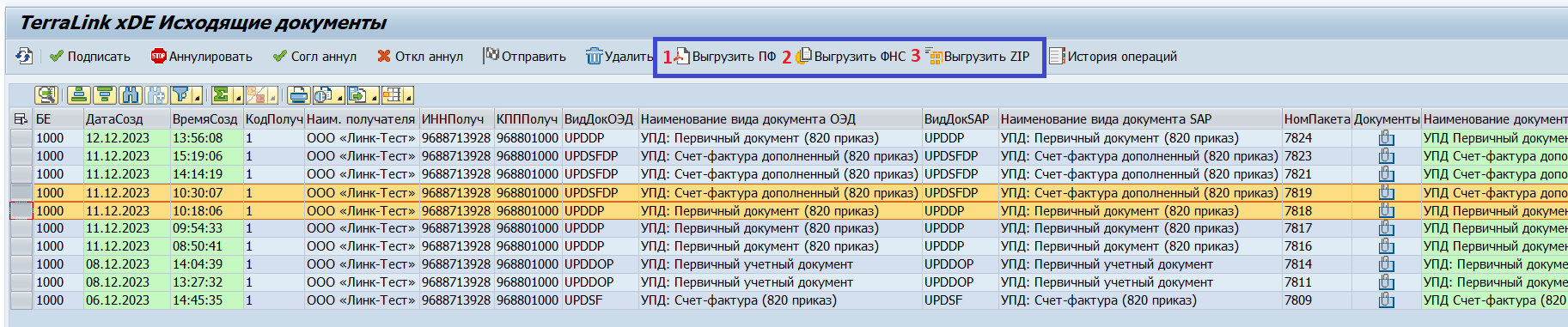 Для того чтобы выгрузить документы в одном из вышеуказанных видов необходимо выделить требуемые документы и нажать соответствующую кнопку (1), (2) или (3).