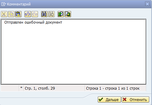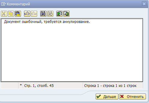 аннулирование документа». Комментарий, введенный пользователем при