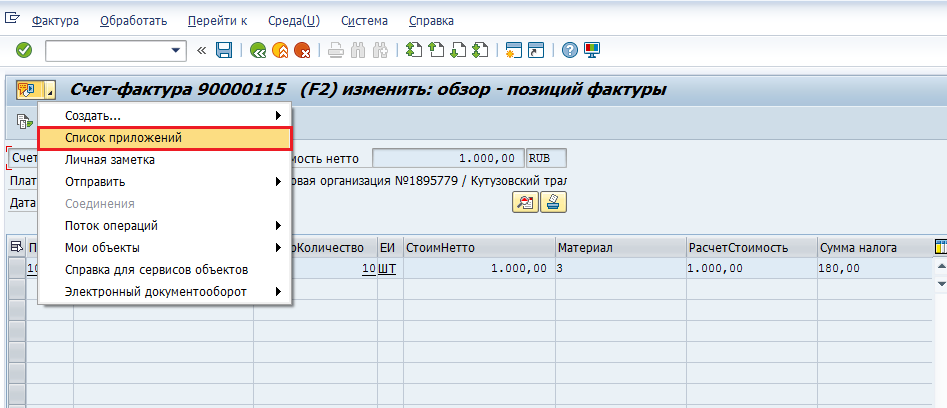 Будет открыто окно со списком приложений к данному БО счету-фактуре.