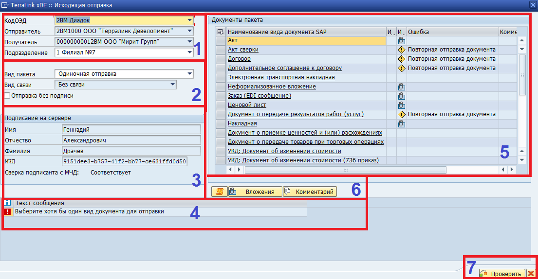 Будет открыто окно для единичной отправки документа. Пример интерфейса единичной отправки документа приведен на рисунке ниже.