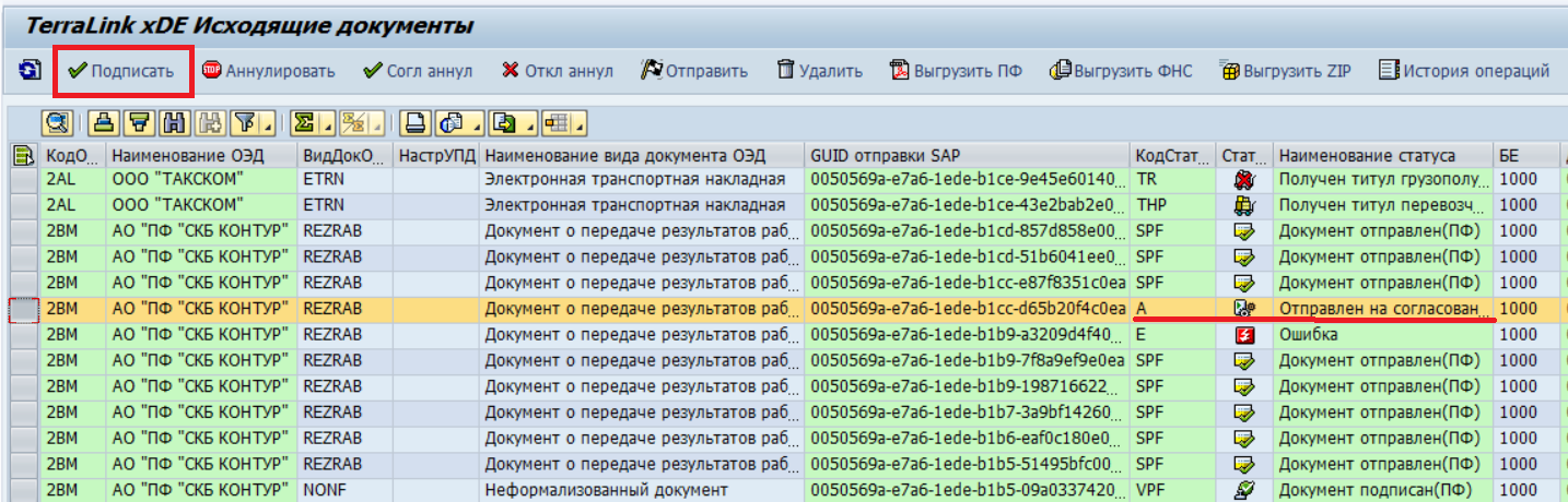 «А – Отправлен на согласование») и нажать на кнопку Подписать.