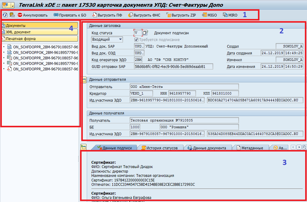 Основные данные — включает наиболее значимые данные отправки: данные заголовка документа, данные отправителя/получателя и данные их подразделений, если таковые участвовали в документообороте.