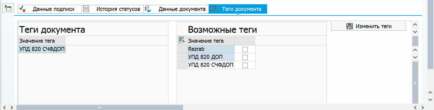 - Теги документа — закладка содержит данные о тегах документа и позволяет вручную изменить перечень тегов, который был присвоен документу автоматически (если теги не передавались, закладка отсутствует).В разделе «Теги документа» отображается текущий набор тегов документа, а в разделе «Возможные теги» общий набор тегов, существующий в настройках Продукта. Для изменения набора тегов необходимо в разделе «Возможные теги» отметить пункты, соответствующие тегам, которые должны быть присвоены документу. После нажатия кнопки «Изменить теги» выбранные теги отобразятся в разделе «Теги документа».